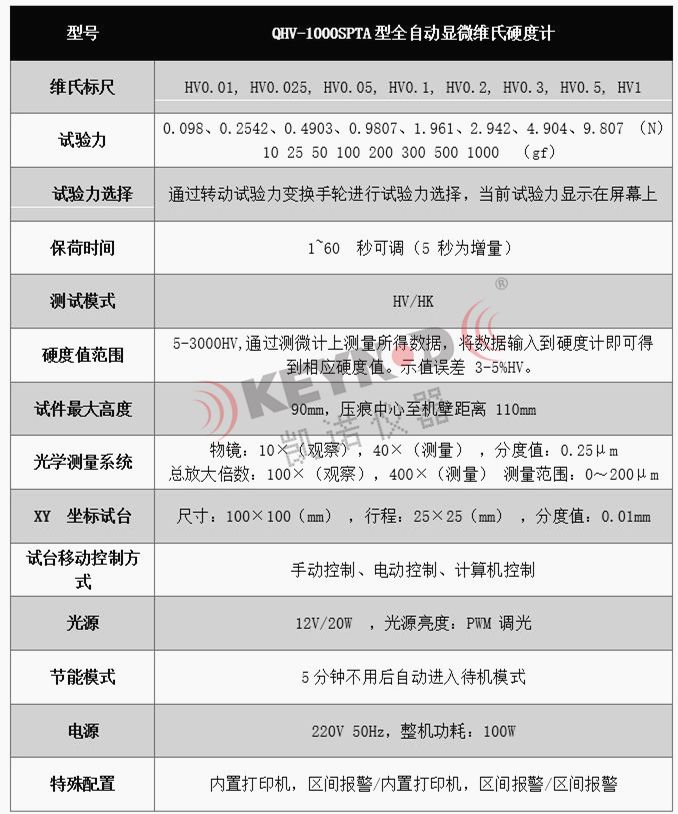 附:QHV-1000SPTA全自动显微维氏硬度计性能指标