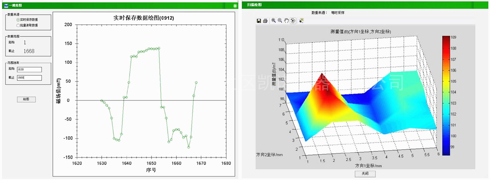 高斯计/特拉斯计配套绘图软件可进行节选数据并进行绘图。绘图坐标可按数据范围选择。为了精确绘制检测图形,绘图软件的Y轴和X轴均可随意设定,Y定义为:磁场强度值(mT)毫特,X轴定义为:数据坐标轴。 您可根据测量数据的范围来设定Y轴的尺度,使您绘制的图形更清晰,绘图分辨率樶高,独特的绘图理念,更方便的制图模式,使磁测数据更直观化。同时可以根据需要,绘制三维图形。