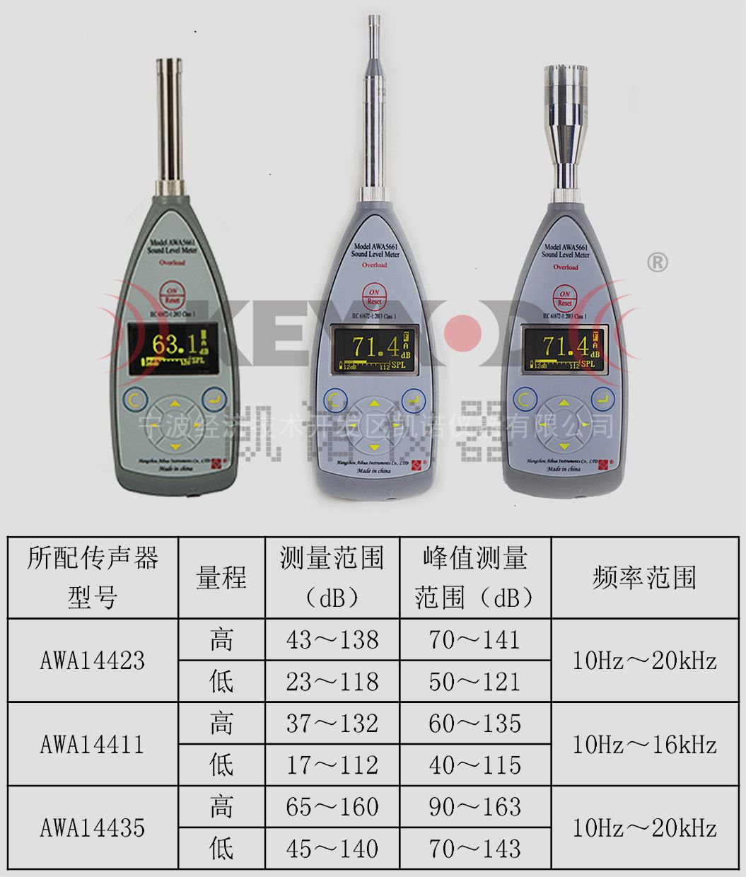 用户可以根据需要为声级计选配特殊传感器用于测量特别高或特别低的噪声,爱华高声级声级计AWA5661-1C量程范围从45 dB(A)到160 dB(A),低声级声级计AWA5661-1B量程范围从17 dB(A)到132 dB(A),客户还可以根据需要设置不同的限值。