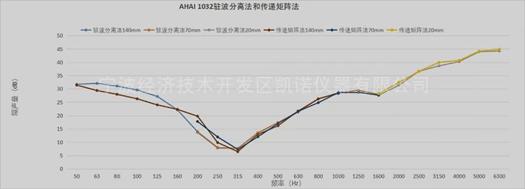 采用同一套AHAI1032隔声量测量系统,分别采用简化的驻波分离法与传递矩阵法(一次测量法)对2mm厚的有机玻璃的隔声量进行测试。从上图可以看出,315Hz以上两种方法的一致性较好,315Hz以下隔声量樶大差值可达5dB。低频产生测量差异的主要原因可以分为两种:一是,传递矩阵法中通过交换通道测量传递函数,得到传递函数校准因数,可以对传声器的幅值以及相位失配做出修正。因此,相对于传递矩阵法,驻波分离法对传声器的幅值和相位一致性的要求更高。二是,传递矩阵法是基于传递函数进行计算的,通过多次平均,传递函数能够降低输入或者输出信号噪声对计算结果的影响,提高系统的抗噪能力。且传递矩阵法(二次测量)还能测量前后两面性质不同的材料的隔声量。 AHAI1032隔声量测量系统按GBZ 27764-2011标准的要求开发而成。支持四传声器传递矩阵法中的一次测量与二次测量,可以对两面同性或不同性的材料进行法向透射系数的测量。由于四个传声器进行了相位及幅度的配对,也支持简化的驻波分离法的测量。