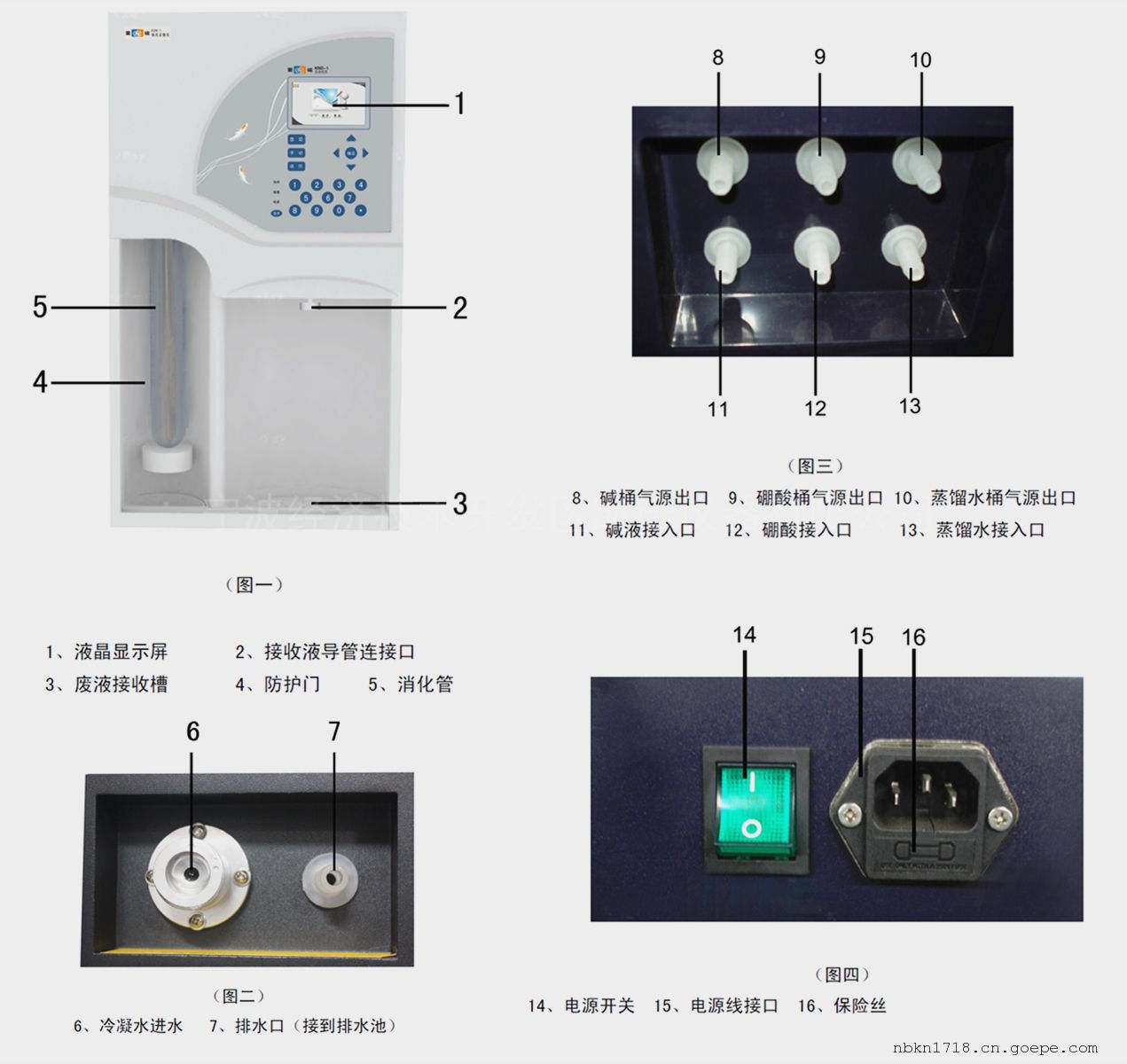 雷磁KND-1型凯氏定氮仪主要用于对土壤、食品、农产品、饲料等样品进行氮及蛋白质含量的测定,该款仪器安装方法如下:先将仪器平稳放置在试验台上,仪器背面应离开墙壁40 厘米以上,电源插座距机器不大于1米,并配备空气开关,漏电开关和可靠的地线。按仪器左视图(图二):冷凝水进水(6)一般情况下连接自来水阀门; 排水口(7)放入排水池,并保证排水通畅。按仪器右视图(图三):碱桶气源出口(8)接碱桶气路管,硼酸气源出口(9)接硼酸桶气路管,蒸馏水气源出口(10)接蒸馏水桶气路管,碱液接入口(11)接碱液桶液路管,硼酸接入口(12)接硼酸桶液路管,蒸馏水接入口(13)接蒸馏水桶液路管。按仪器后视图(图四):电源线接口(15)接电源线,保险丝(16)为更换保险丝的位置(仪器出厂前保险座内有两只保险丝其中备用一只),电源开关(14)打开,机器即通电工作。