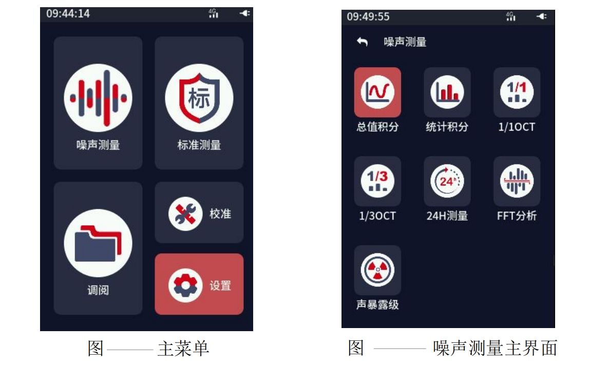 (1)按声级计屏幕下方开关键 1 s 开机,长按开关键+返回键 10 s 左右强制仪器复位。开机后屏幕显示主菜单。