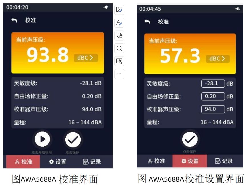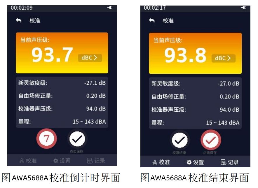 (7)“点击保存”按钮:点击保存当前校准记录,或者当校准器声压级有变化时,点击保存校准记录。
