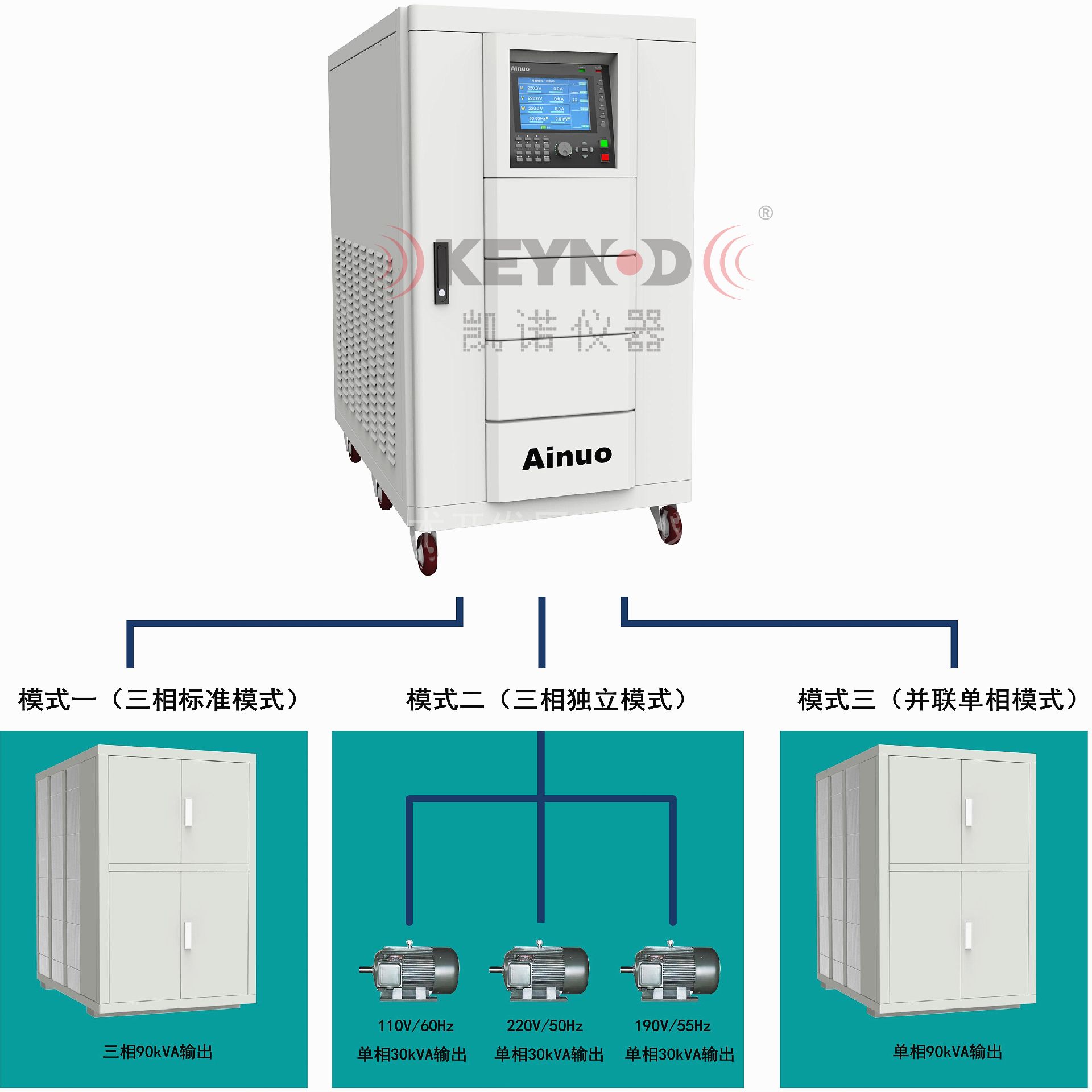 电源管理模式:三相标准模式、三相独立模式(三相电压、频率,均可独立调节)、并联单相模式(三路并联单相输出),实现“一机多用”;