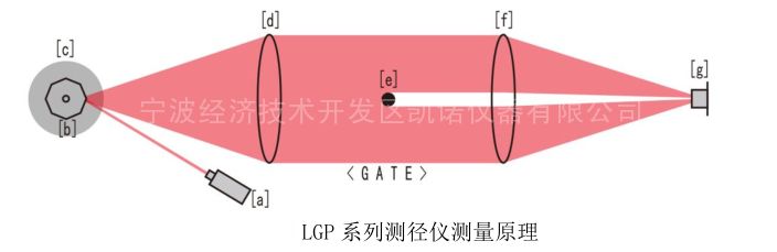 由半导体激光器“a”发出激光束,通过电机“c”带动八棱镜“b”高速旋转,将激光器光束扫描通过棱镜“d”转换为平行光通过测试区(GATE),当测试区有被测物“e”时,其会遮挡住部份平行光,并通过聚焦棱镜“f”在光电接收管上转换成低电平;而没有被测物遮挡的平行光则转换为高电平,通过计算低电平的扫描时间,则可计算出被测物在激光束扫描方向的外径值。