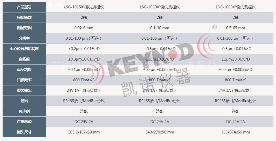 双轴激光测径仪奥美加LSG-1060XY、LSG-1030XY、LSG-1015XY的主要性能指标对比: