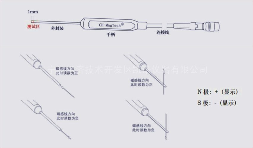 砷化镓Hall探头一项高技术产品,它具有同类产品樶小封装尺寸,轴向探头可做到径向直径 0.9mm。横向探头可做到厚度 0.5mm,是目前世界上封装尺寸樶小的探头。其具有磁线性度好,一致性好,温漂微小等特点。可定制耐高低温探头满足国防科研特殊需要。 常规探头结构如下图中所示,分为连接线、手柄和探头外封装。连接线尽头的插头中配有储存器,其中记录着每一支探头的校准信息。传感器位于探头外封装内,距离外封装顶端向内 1mm 左右,测试范围即有 源区边长为 0.15mm。轴向与横向探头内传感器的安装方向不同,导致其所测量的磁场敏感方向也不同,在磁场方向与传感器 感应面垂直时读数误差为*小。
