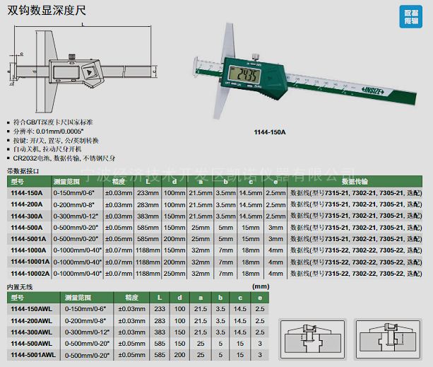 INSIZE英示正品原装双钩数显深度尺1144系列技术指标:产品