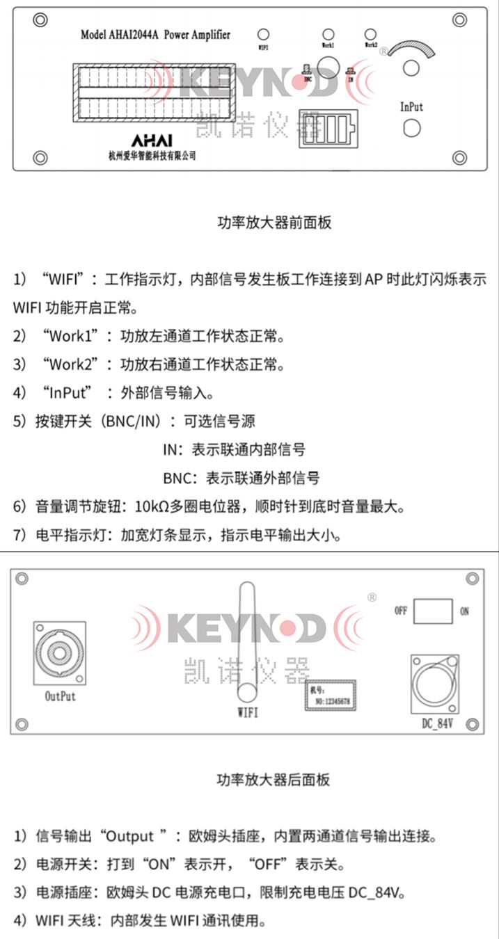 本套设备由AHAI2044A型功率放大器、AHAI2031A型正十二面体声源、AHAI7005型线缆组成。推荐搭配本公司AHAI1002型无线建筑声学测量系统、AHAI1003型无线厅堂声学测量系统使用。(一)AHAI2044A型功率放大器技术指标: