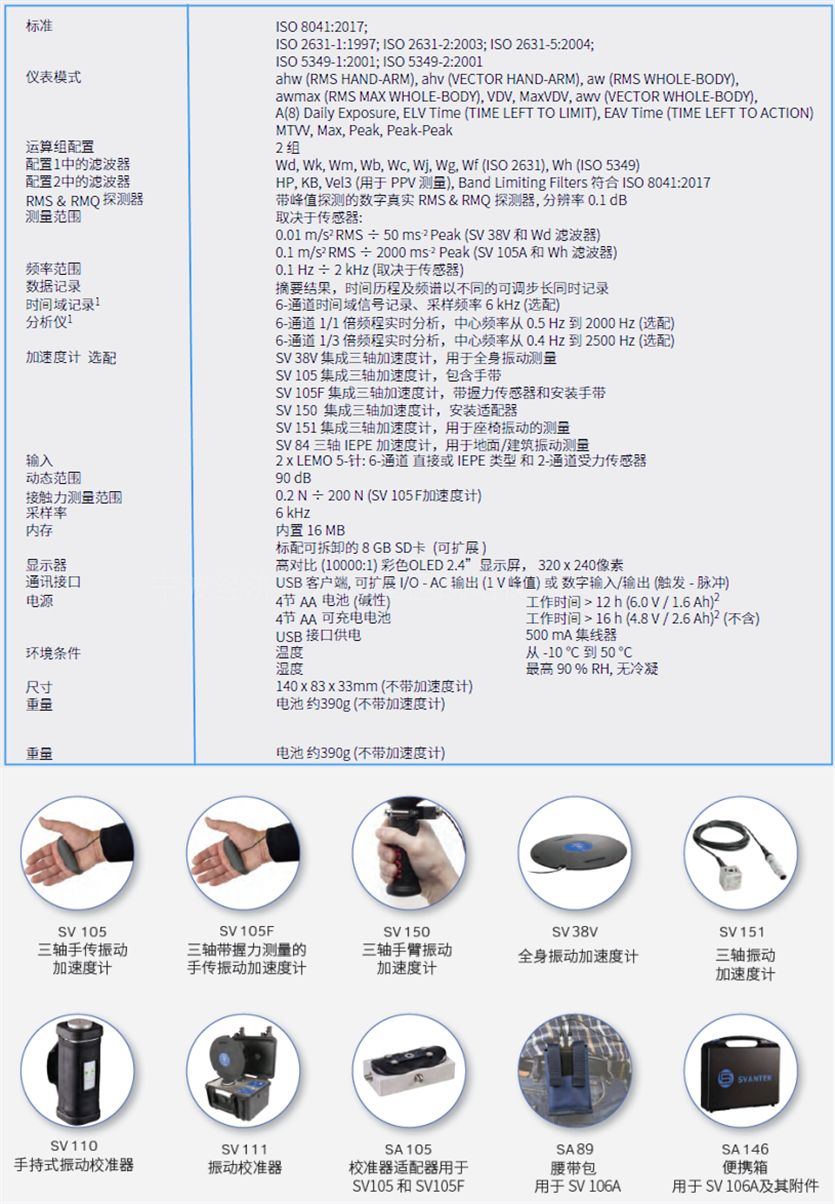 SV106A该仪器符合ISO8041:2005标准,是基于ISO2631-1,2&5以及ISO5349标准进行测量的一个理想选择。RMS,Peak,Peak-Peak,VDV,MTVV,A(8)或者Dose的结果,以及所有的HVM测量所需要的加权滤波器,在这个仪器上都是可用的。先进的于内建微SD闪存卡进行的时间-历史存储和时域信号记录(基于ISO2631-5标准)功能,几乎可以提供无限的数据存储空间。数据结果可以方便地通过使用USB接口和SvanPC+软件下载到PC机上。SvanPC+软件也同时提供设定-编辑功能,用于管理仪器的设置。有可以被直接放置在座垫,地板或者固定于座椅背面的SV38座位加速计的存在,全身振动测量才显得更加简便。带有三轴加速度计的SV50设备可以实现手臂振动测量,而不用考虑评估工具的类型。另外,对于很高冲量振动的测量,可以使用专门的SA55和用于保护加速计免于直流转换效应影响的低通机械过滤器的组合。快速的USB1.1接口(12MHz)为SVAN106仪器的PC采样前端设备提供了实时连接能力。测量的结果可以使用上述的任一接口下载到PC机上。该仪器由四个AA标准或者可充电电池(比如,镍氢电池-需要分开充电)进行驱动。同时,仪器也可以通过USB接口进行供电。结实而轻便的设计让这新一代产品更显示出超凡的性能。