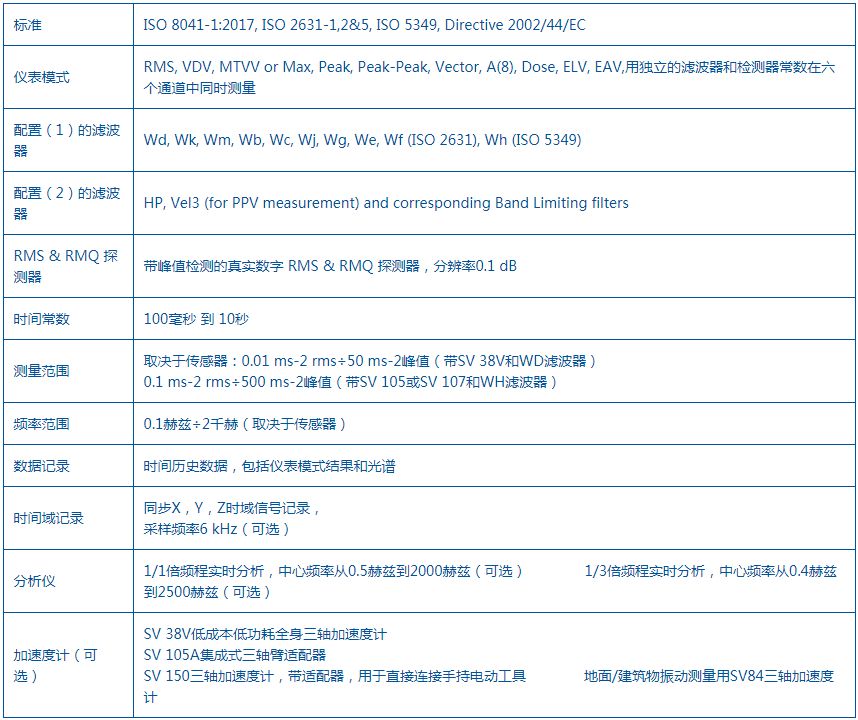 该设备符合ISO8041:2005标准的人体振动测量ISO 2631-1,2&5(包含VDV 和 MTVV)以及 ISO 5349标准;拥有用于加速度测量(IEPE类型)的六通道,以及用于力测量的两通道;时域信号记录(符合ISO 2631-5标准);先进的含谱分析功能的数据存储;用于大量数据存储的微SD闪存卡;USB1.1 客户端接口;累积可编程的时间达到24小时;用于方便仪器设置和数据下载的SvanPC+软件;使用方便,带彩色显示的用户友好界面等。