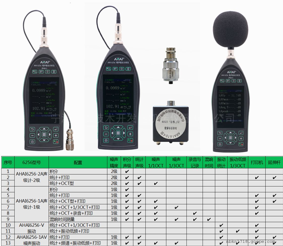 杭州爱华智能AHAI6256系列新升级振动噪声一体机(主机一体),AHAI6256-A系列为多功能声级计(1级、2级可选),AHAI6256-V系列为多功能振动分析仪、AHAI6256-1AV为振动噪声一体机,模块化设计、用户可根据需要进行功能选择,支持远程功能升级,前两个系列也可以等后面需要再配振动或噪声传感器升级为噪声振动分析仪。