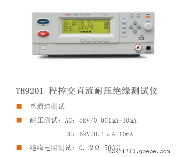 TH9201型同惠程控交直流耐压绝缘测试仪产品特点:❈耐压测试: AC: 5kV/0.001mA-30mA,DC:6kV/0.1 u A-10mA