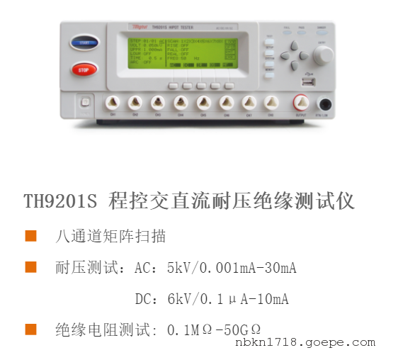 八通道交直流耐压绝缘测试仪同惠TH9201S产品特点:❈耐压测试: AC: 5kV/0.001mA-30mA,DC: 6kV/0.1 u A-10mA