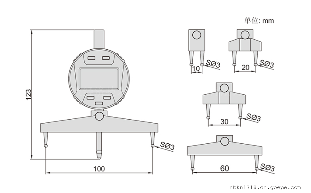 按键:开/关,数据保持,公/英制转换,选择量爪,置零