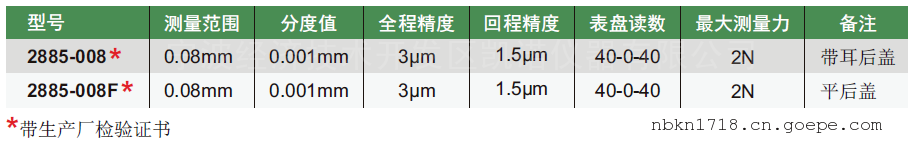 英示2885高精度单转杠杆千分表有两个型号2885-008(带后耳盖)和2885-008F(平后盖),参数相同,详见规格表。宁波凯诺仪器代理销售INSIZE英示品牌量具量仪,如有需要,欢迎您来电咨询采购!