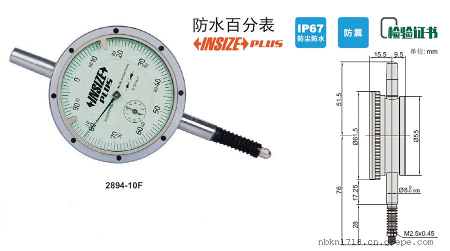 详细信息| 询价留言品牌:INSIZE英示 型号:2894-10F 加工定制:否 类型:指针式 规格:2894-10F 量程:10mm INSIZE英示2894-10F防水百分表