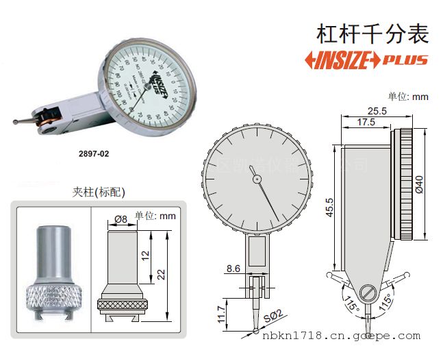 英示2897-02杠杆千分表标配直径8mm夹注,测针可根据需要进行选配。宁波凯诺仪器代理销售INSIZE英示品牌量具量仪,如有需要,欢迎您来电咨询采购!INSIZE英示2897-02杠杆千分表产品特点: