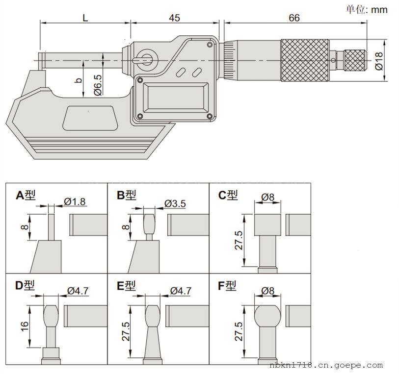 测杆头部测量而为硬质合金配标准杆(除0-25mm/O-1"外)
