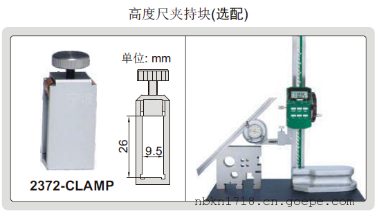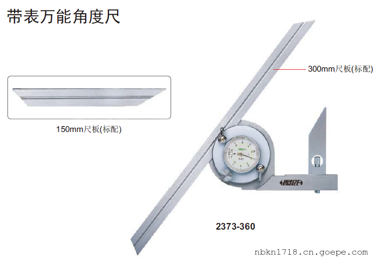 可选附件:高度尺夹持块(型号2372-CLAMP),适用于1351, 1156, 1151, 1150-300C和1250系列(除1250-1000外)高度尺INSIZE英示2373-360带表万能角度尺技术参数: