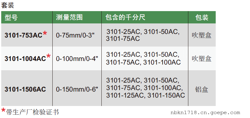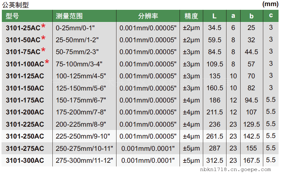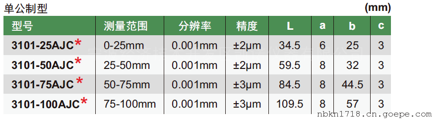 INSIZE英示3101系列防水数显外径千分尺规格参数:
