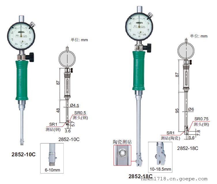 INSIZE英示2852-10C/18C百分小孔内径量表型号参数: