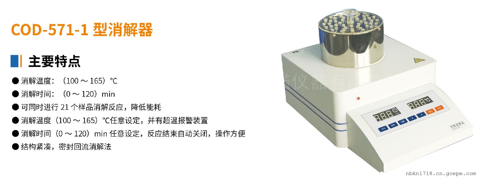 配套装置:COD-571-1型消解装置是COD-571型化学需氧量测定仪的配套消解装置,可同时进行21个样品消解反应,降低能耗。