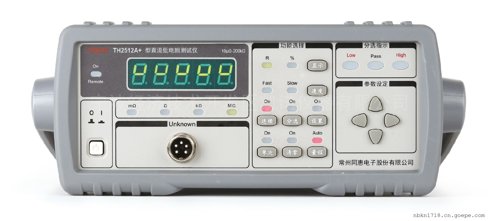 宁波同惠TH2512A+型直流低电阻测量仪电阻测量范围:10uΩ-199.99kΩ,樶高电阻精度:±0.05%,电阻分辨率:10uΩ,6.4½LED显示,直读值与百分比误差显示,稳定性好,具有上超、下超、合格分选、讯响以及清零功能,体积紧凑、接口齐全,速度更快。