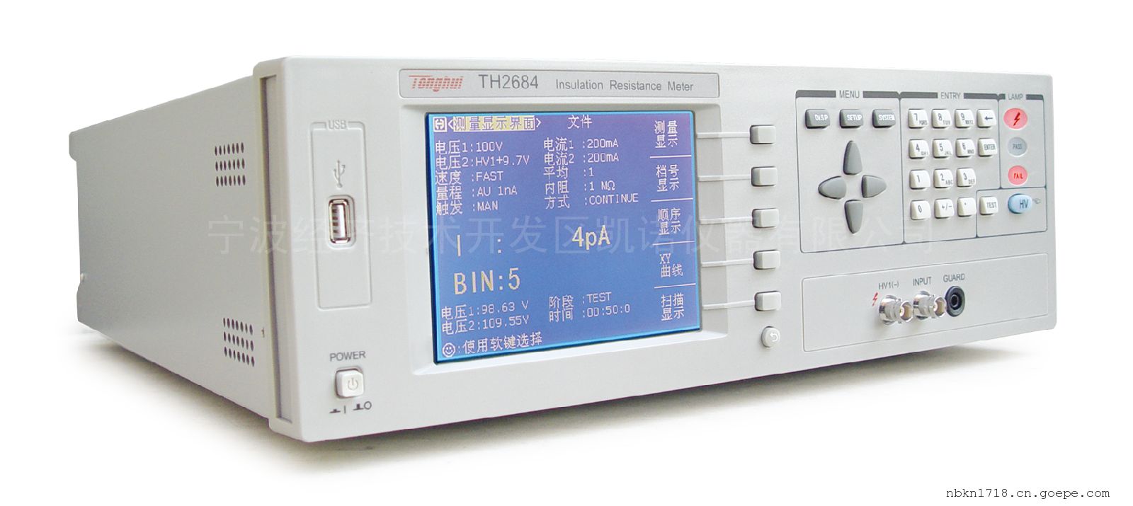 宁波同惠TH2684型绝缘电阻测试仪采用大尺寸的液晶显示屏,人性化的菜单布局,操作方便;可切换输入内阻技术和内置双电压输出,支持预充电,以及接触检查功能,使得仪器可实现电容IR的快速一般技术参数测试。TH2684还可由用户自行编程测试步骤,樶多可达18步。例如,用户可编程充电,等待,测试,放电等,每个步骤樶长可持续100s。TH2684标配RS232,USB DEVICE,Handler等接口。其中Handler接口为实现自动测试系统提供了方便。扫描口,则为大量元器件的测试提供了方便。用户还可以配一台扫描仪来加快元器件的测试。TH2684具有两路电压输出功能,预充电电压输出和测试电压输出分别设置,预充电电压输出可设置成跟随测试电压变化,并可在此基础上微调,此外,也可设置为独立电压输出模式。